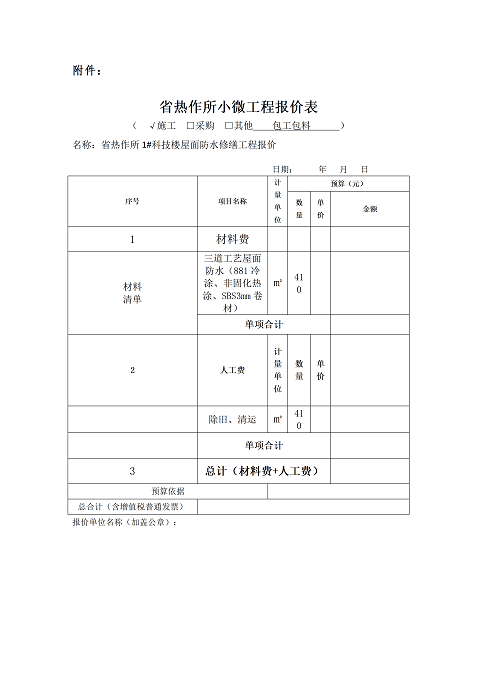 1、所本部“省热作所1#科技楼屋面防水修缮工程”,面积410平方,包含清洗及垃圾运出我所并充分考虑防水及保护层的耐用性。